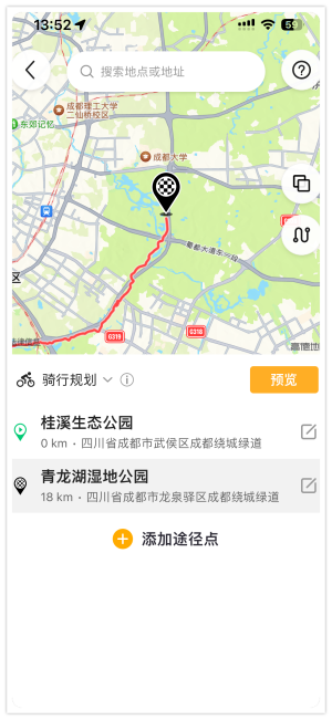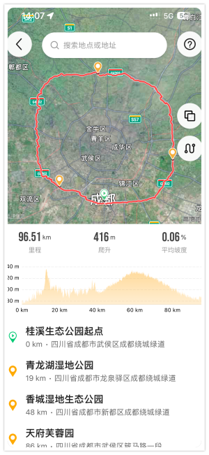 在我们最新的优化算法中,成都的环城绿道只需要三个途径点就可以规划出一整条绿道骑行路书了。