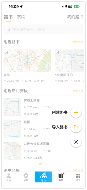 1.打开行者APP,点击路书,进入路书页面,点击”+”按钮,选择”创建路书”,即可进入路书制作页面。