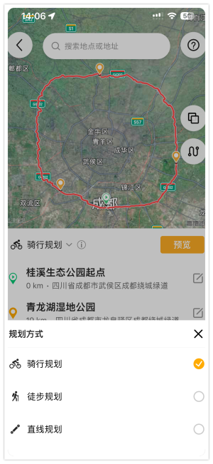 如果在一些地方骑行路线规划无法通过的时候可以通过切换规划方式,例如改成徒步或者直线的方式。如果您非常熟悉路况或者通过卫星地图观察有道路可以通过,但是当地的路线路网没有更新,无法通过,可以通过此种方式来规划。
