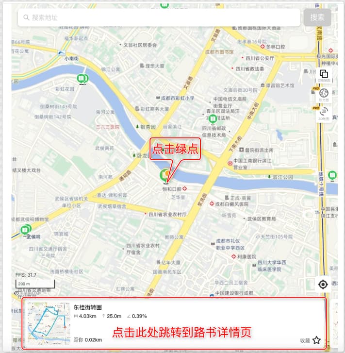 点击出现在地图上的绿色的路书标志,可以在地图下方看到该路书的简略图。点击该图可以进入路书详情。
