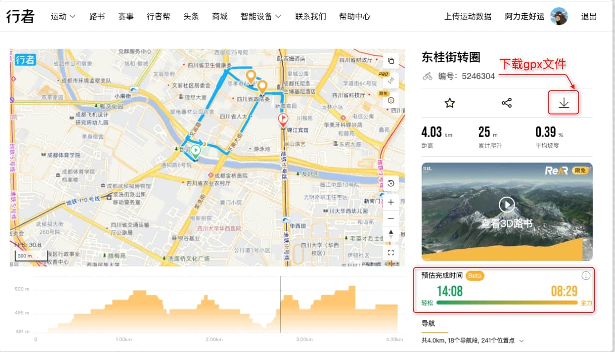 进入路书详情页后,可以看到基于您运动记录的骑行预估时间。点击右方的下载GPX文件,下载完成后,可以将路书导入码表。