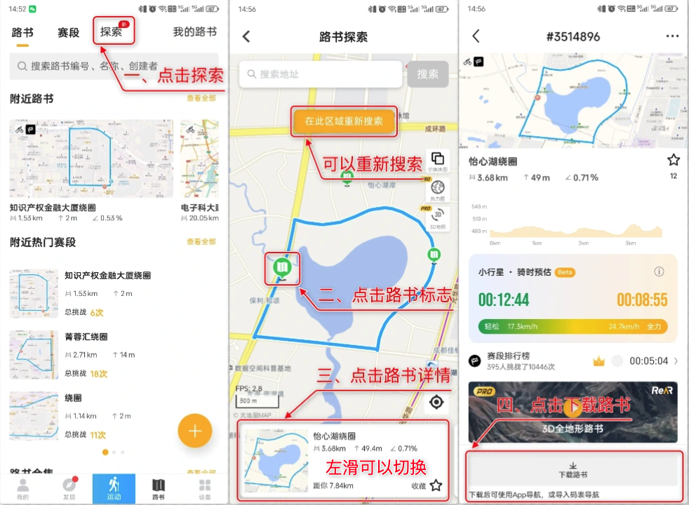 进入路书详情页后,可以看到基于您运动记录的骑行预估时间。该路书对应的赛段排行榜。点击下方的下载路书,下载完成后,可以使用APP进行导航,或者将路书导入码表。