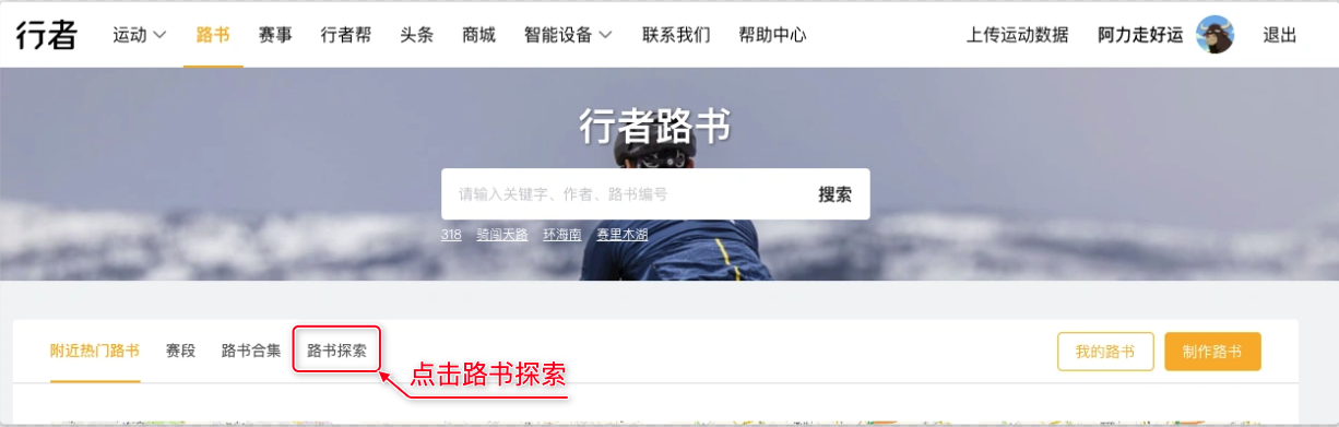 进入「路书探索」页面后会自动匹配你所在的定位附近的推荐的路书。如果定位不准确,可以拖动地图